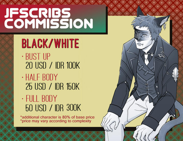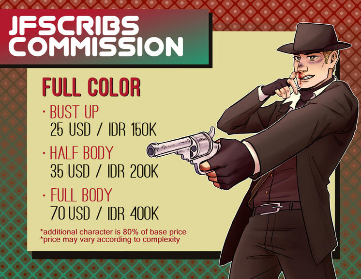 COMMISSION ARE FOR PERSONAL USE ONLY. (E.g. socmed icon/banner/print for yourself/etc.) you are not allowed to use the finished work for monetary or commercial purpose.